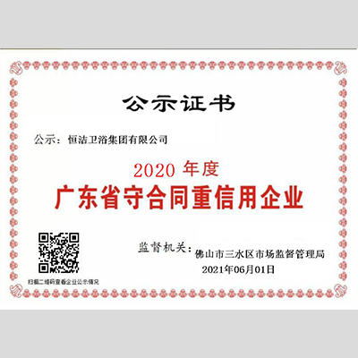 獎 項:2020年度廣東省“重合同守信用”企業 ——恒潔衛浴集團