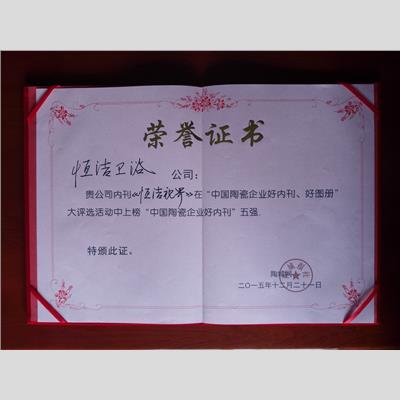 獎 項:《恒潔視界》“中國陶瓷企業好內刊”五強
