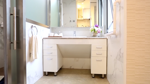 恒潔衛浴作為設計師選用的品牌,在了解了委托人的特殊情況后,為小李量身定制浴室柜,其鏡面有5度角的斜度,可以給輪椅使用者看到全身,同時也不影響普通人的使用,臺面下沿距離地面680mm,保證輪椅使用者的腿部有足夠的空間。