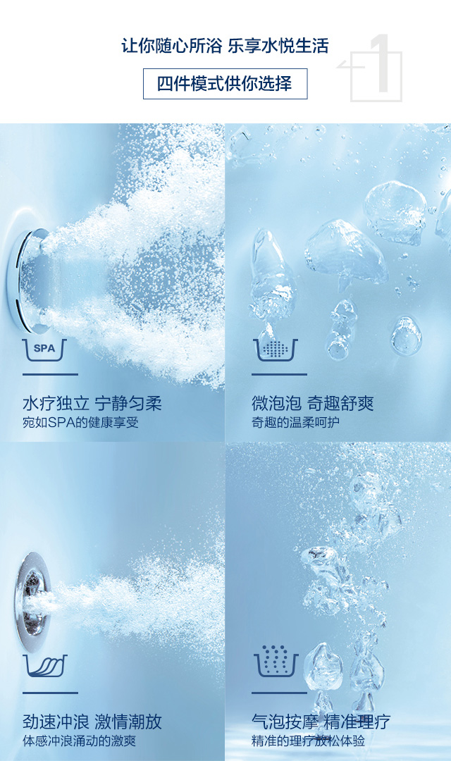 水療獨立按摩系統、勁速沖浪按摩系統、微泡泡按摩系統及汽泡按摩系統三件模式供你選擇,讓你隨心所浴,樂享水悅生活
