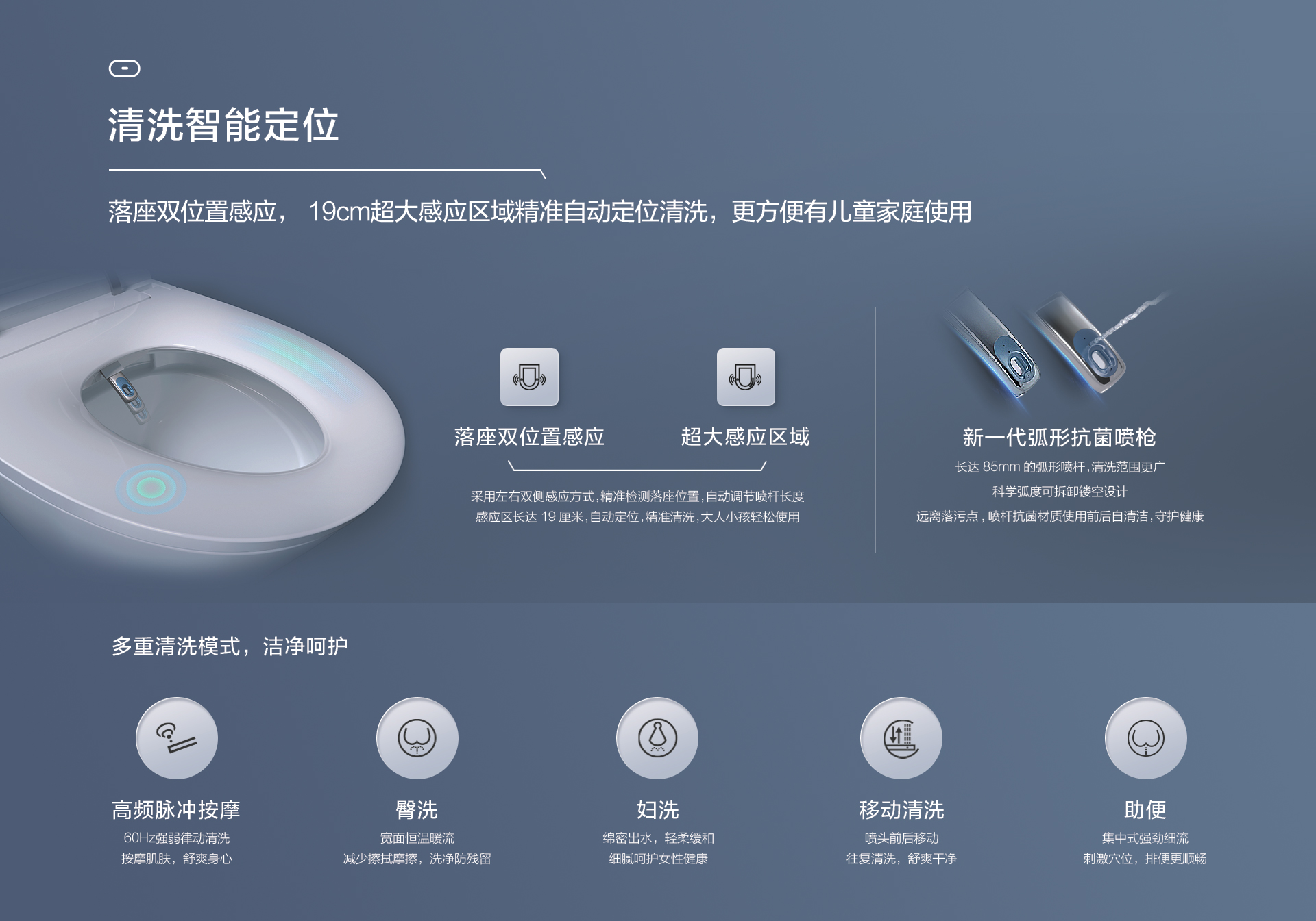 清洗智能定位:落座雙位置感應,19cm超大感應區(qū)域,精準自動定位清洗,更方便有兒童家庭使用